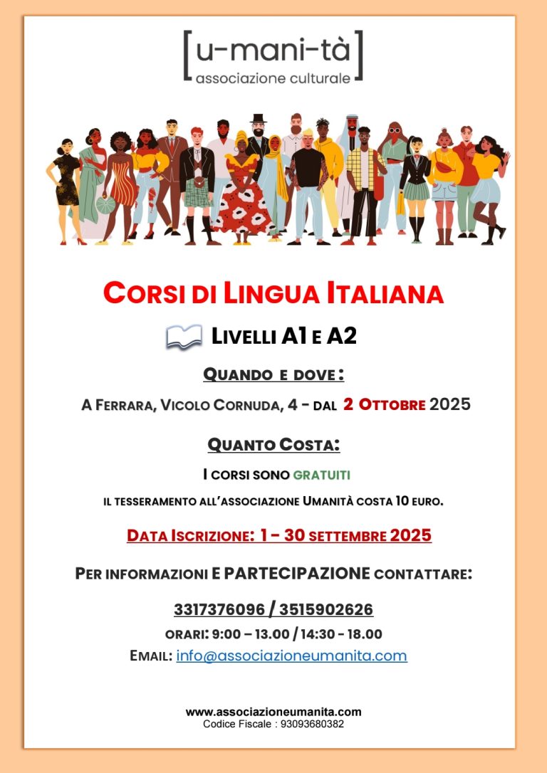 L'associazione Umanità organizza corsi di lingua italiana di livello A1 e A2, offriamo un'alfabetizzazione linguistica di base (Livello A2) per aiutare i cittadini stranieri di Ferrara e provincia ad integrarsi nella vita sociale e culturale. I corsi sono pensati soprattutto per lavoratori stagionali e rifugiati politici. Il nuovo corso inizia dal 2 ottobre 2025 e terminerà in aprile 2026. La responsabile del progetto è Prof.ssa Annabella Ferroni. I nostri insegnanti ed educatori vantano decenni di esperienza nell'insegnamento e nel supporto interculturale. Associazione Umanità si sta adoperando affinché, al termine del corso, ai partecipanti vengano rilasciati attestati dagli enti preposti. Per partecipare ai corsi Contattare da lunedì a venerdì ore 8:30 - 13:00 / 14:30 - 18:30 il numero di telefono : 3317376096 - o inviare una mail a : info@associazioneumanita.com